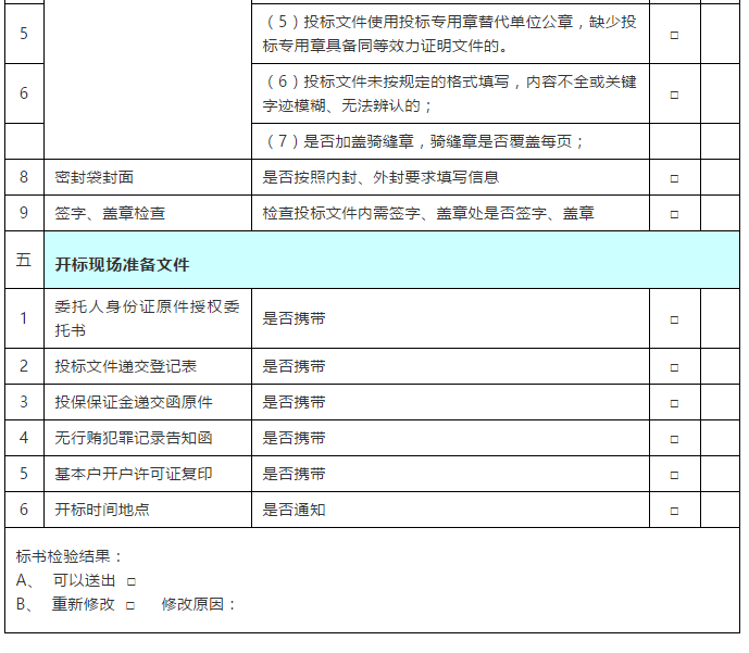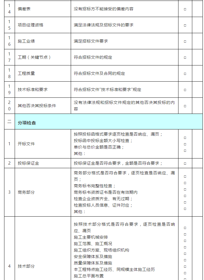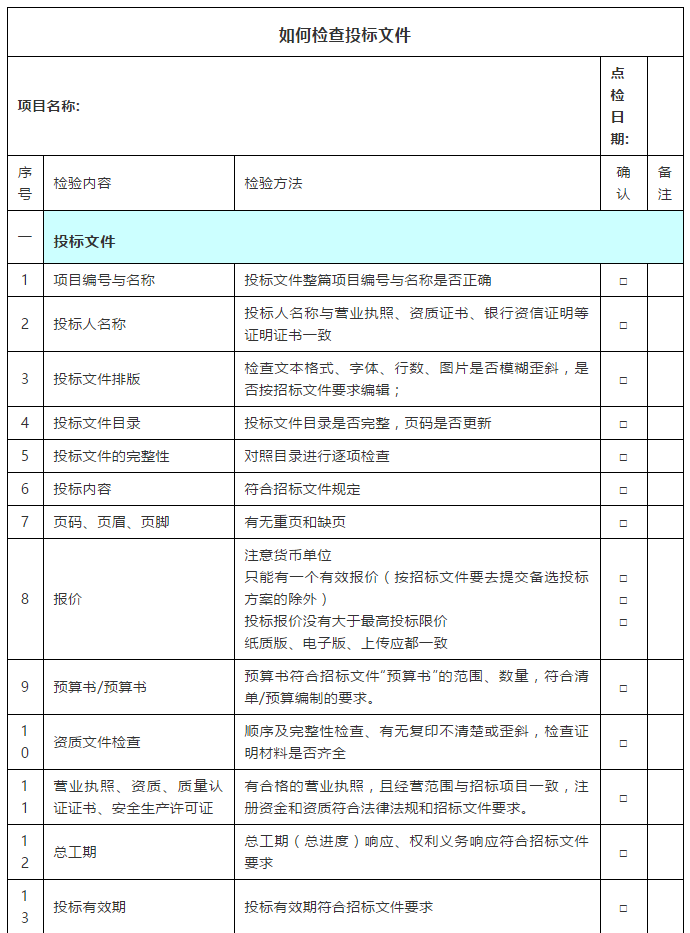 根據(jù)招標(biāo)文件,好不容易辛苦制作的標(biāo)書,卻在開標(biāo)時因為一些細(xì)節(jié)未注意而遭遇廢標(biāo)。按照下面這個表來檢查,5分鐘妥妥搞定!